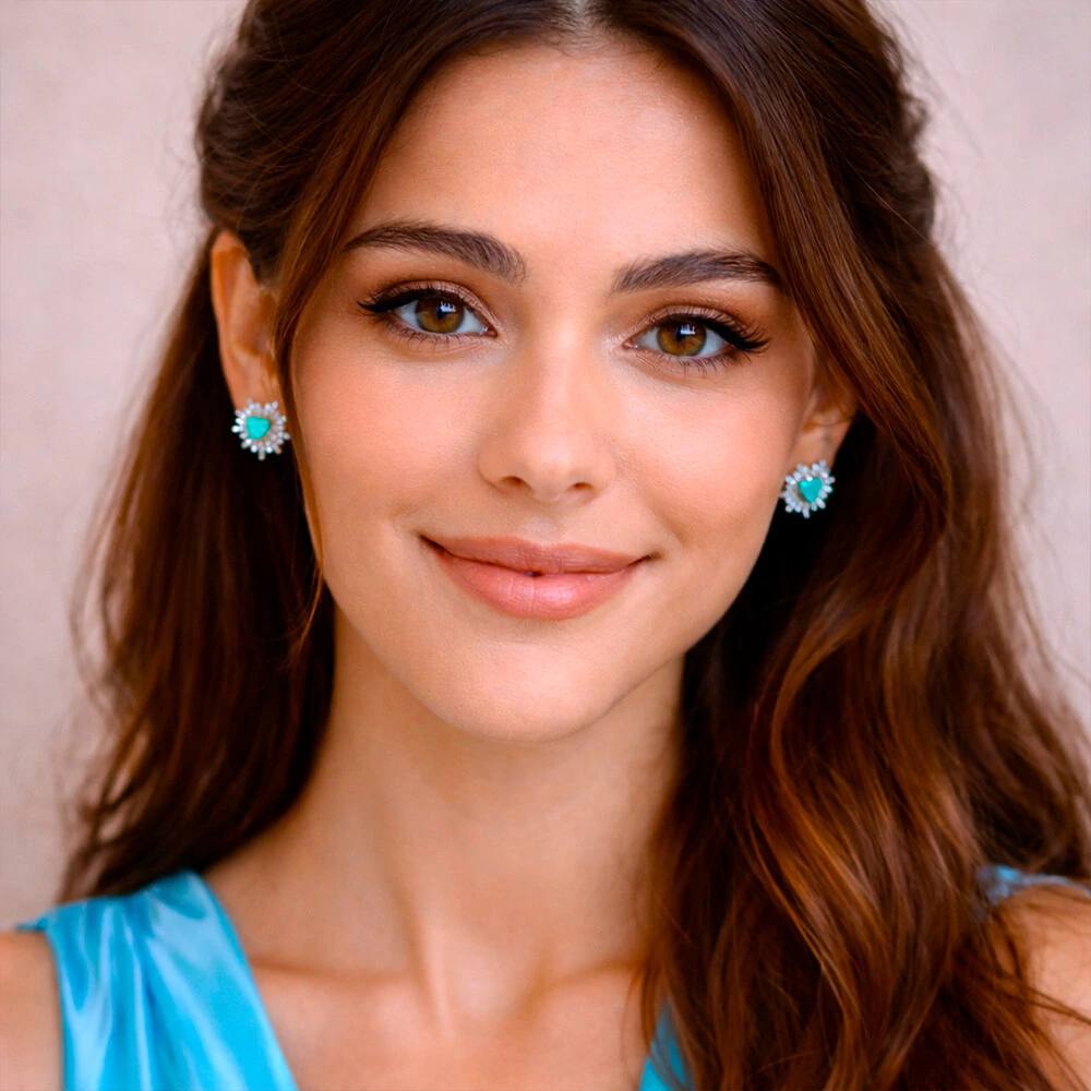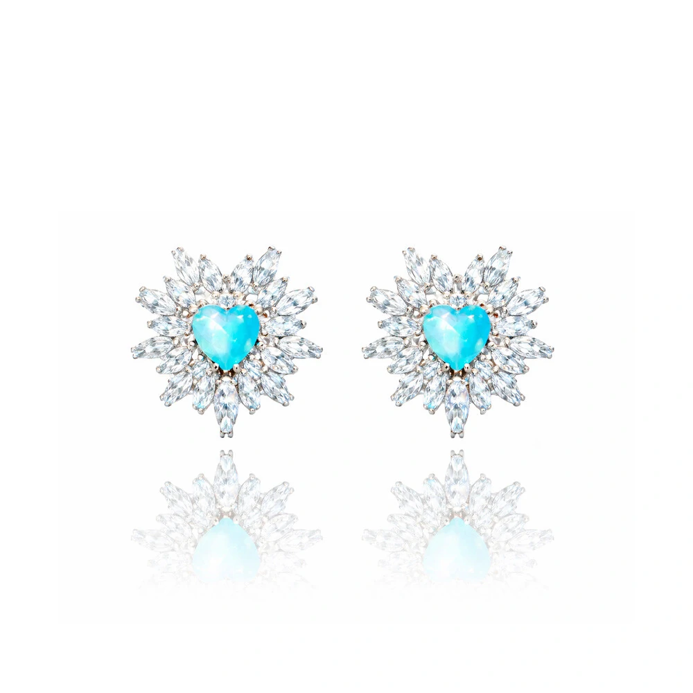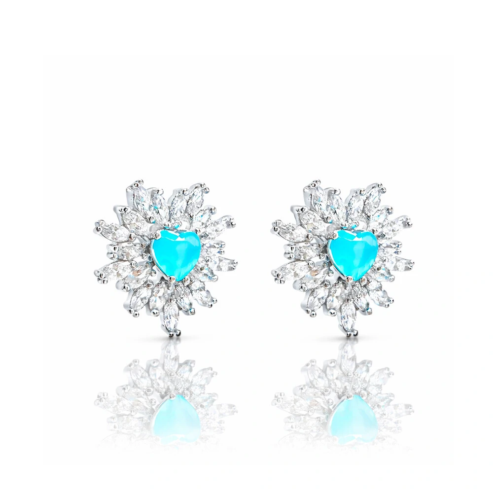 Brinco Scarlate com Cristal Turquesa e Zircônias banhado em Ouro Branco.