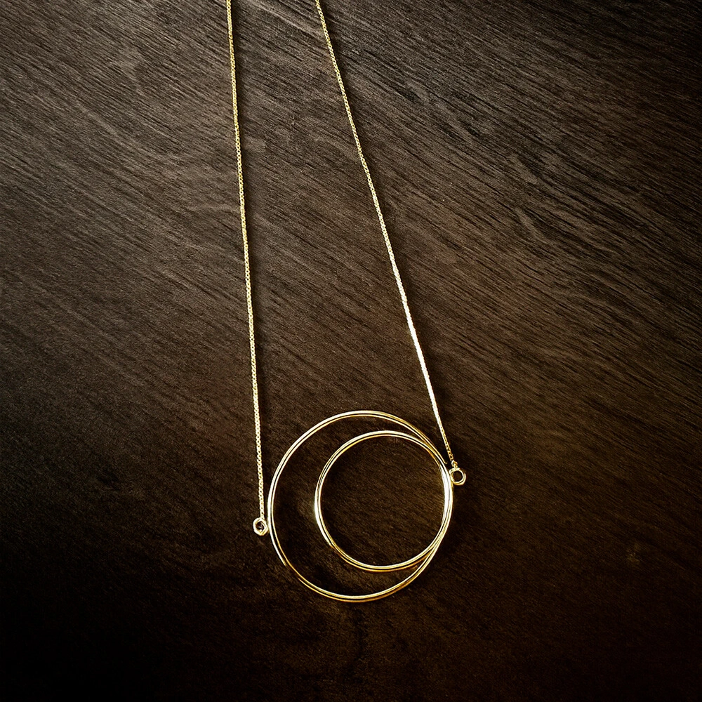 O Colar Eclipse em Ouro Amarelo 18K traduz a harmonia entre forma, significado e elegância atemporal. Seu design de círculos entrelaçados simboliza conexão, continuidade e encontros que deixam marcas — um conceito forte para quem valoriza joias com propósito.